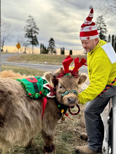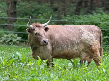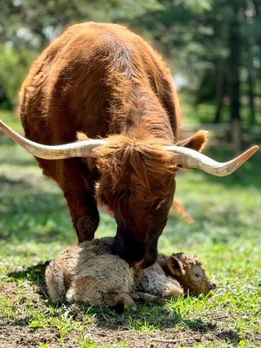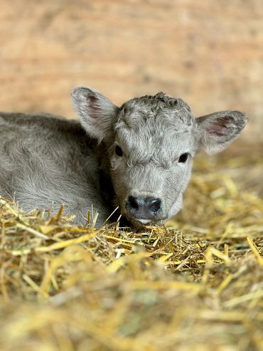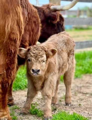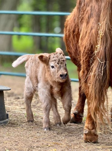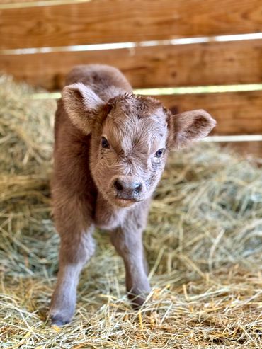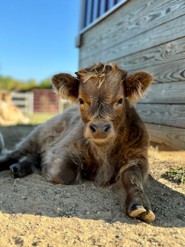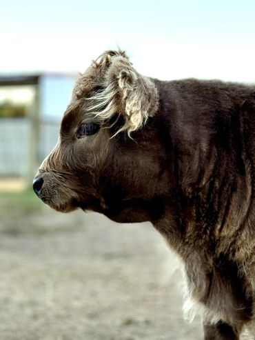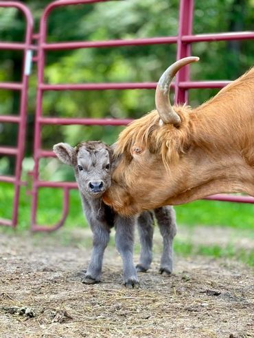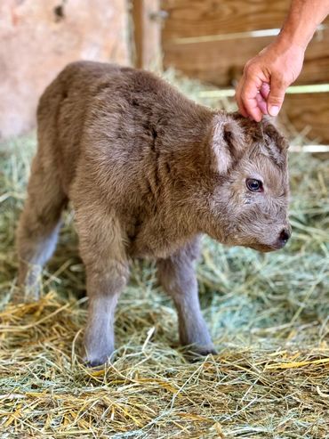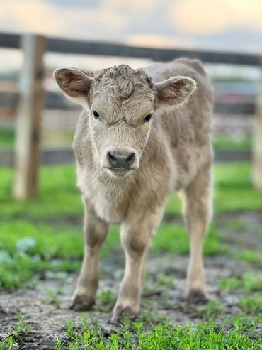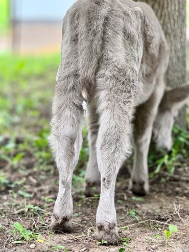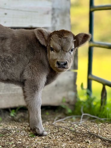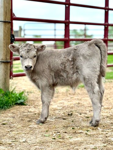 Bandit- DOB 6/26/25 Silver bull calf. Top line measurement 24”at birth. Bandit loves people and is the first to come get attention from us just like his full sister Ada. He loves to be brushed and groomed and is doing very well with his halter training. Dam Ella 42”-Sire Mercury 46”. (We measure all cows top line at the hook of the hip) This playful, friendly calf would make an incredible addition to any herd. Available as a Bull or steer.
