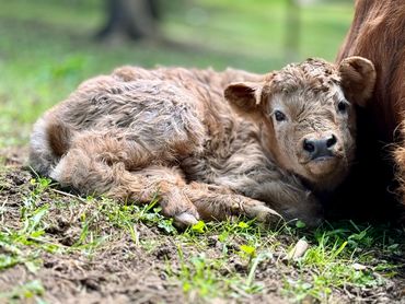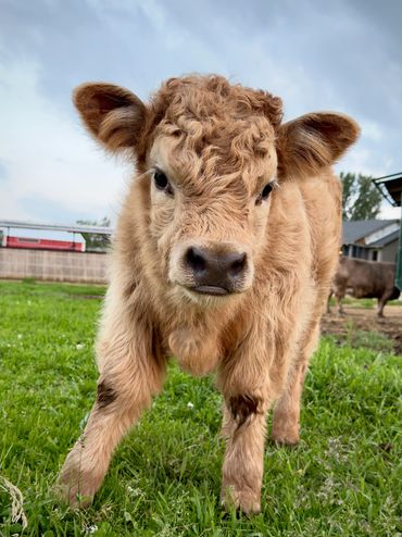 ALFIE dob 4/27/25 Yellow Chondro positive bull calf. Top line measurement 22” at birth. The most inquisitive friendly calf we have produced to date. Stocky, well built, adorable short wide face. Dam Rosie 40”-Sire Mercury 46”. (We measure all cows top line at the hook of the hip) This cute little yellow guy can add all colors to your herd! Available as a Bull or steer.